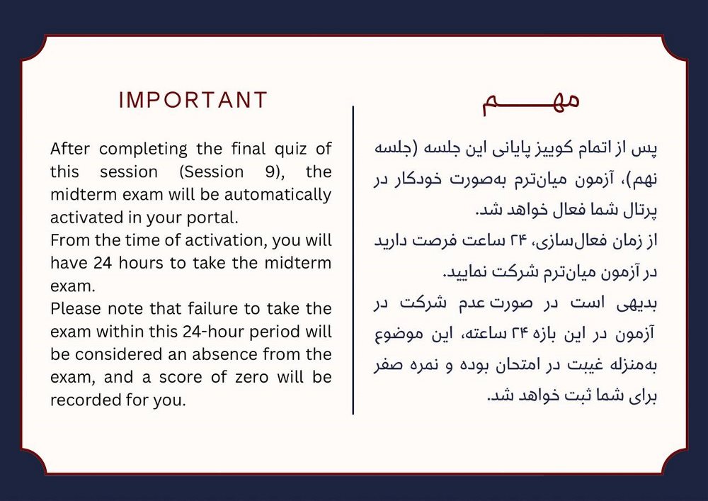 اینجا دیگه کامل درس برات جا میفته چون هوش مصنوعی یه عالمه تمرین از این درس برات طرح کرده که میتونی خودتو محک بزنی.استرس نمره نداشته باش، این بخش فقط تمرینه. اگر هم اشتباه گفتی فدای سرت، میتونی دوباره امتحان کنی تا به جواب درست برسی.