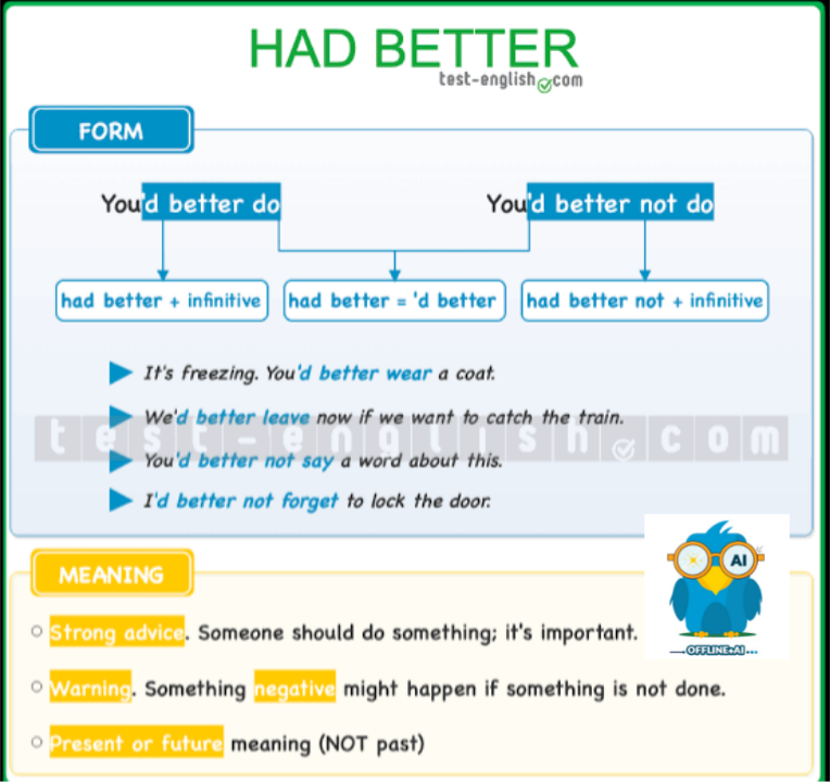* *I'd better (I had better):* برای اشاره به یک توصیه یا کاری که باید انجام شود تا از یک پیامد منفی یا مشکل در آینده جلوگیری شود. این عبارت حس اضطرار بیشتری دارد و به یک موقعیت خاص اشاره میکند.